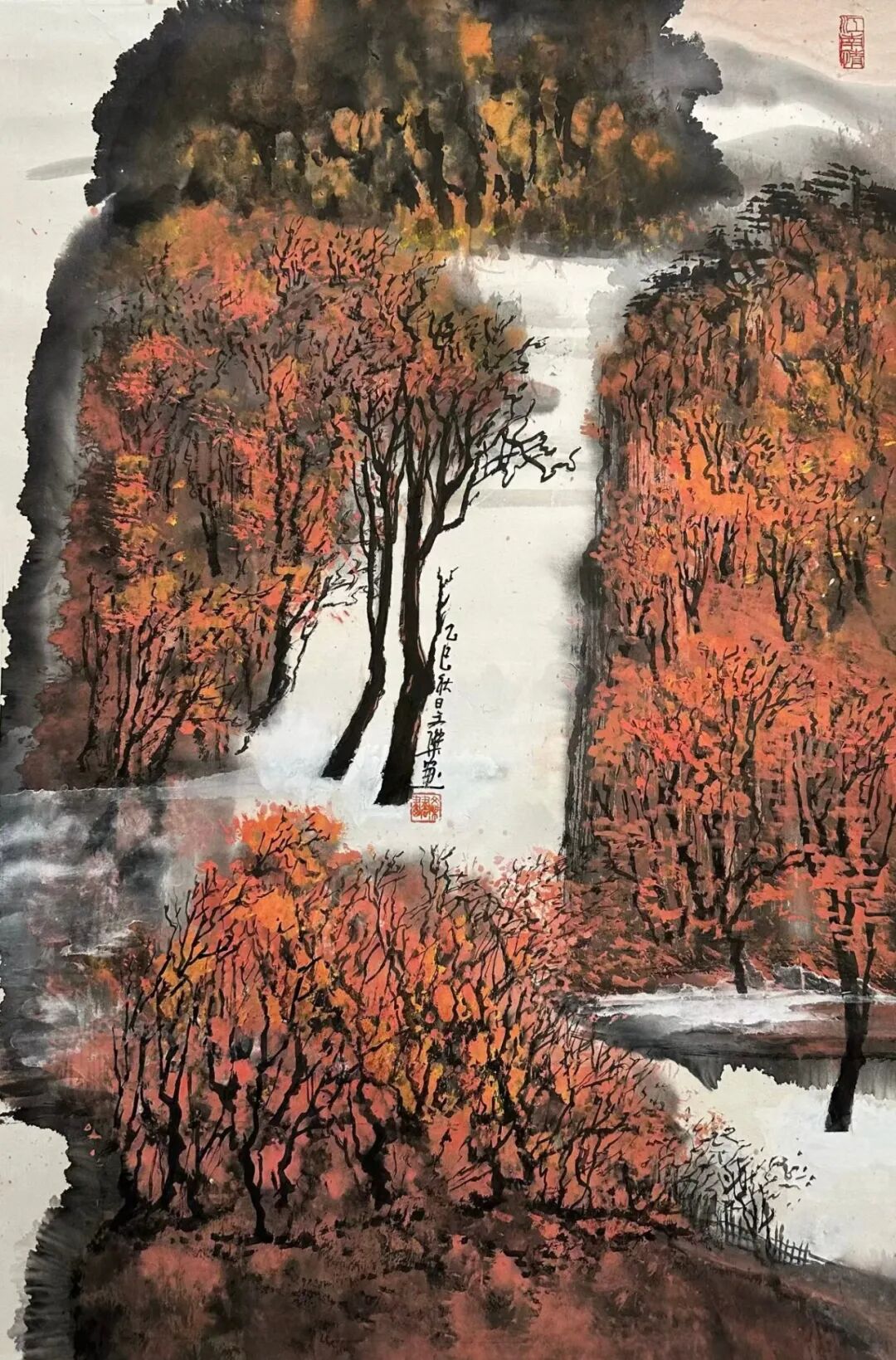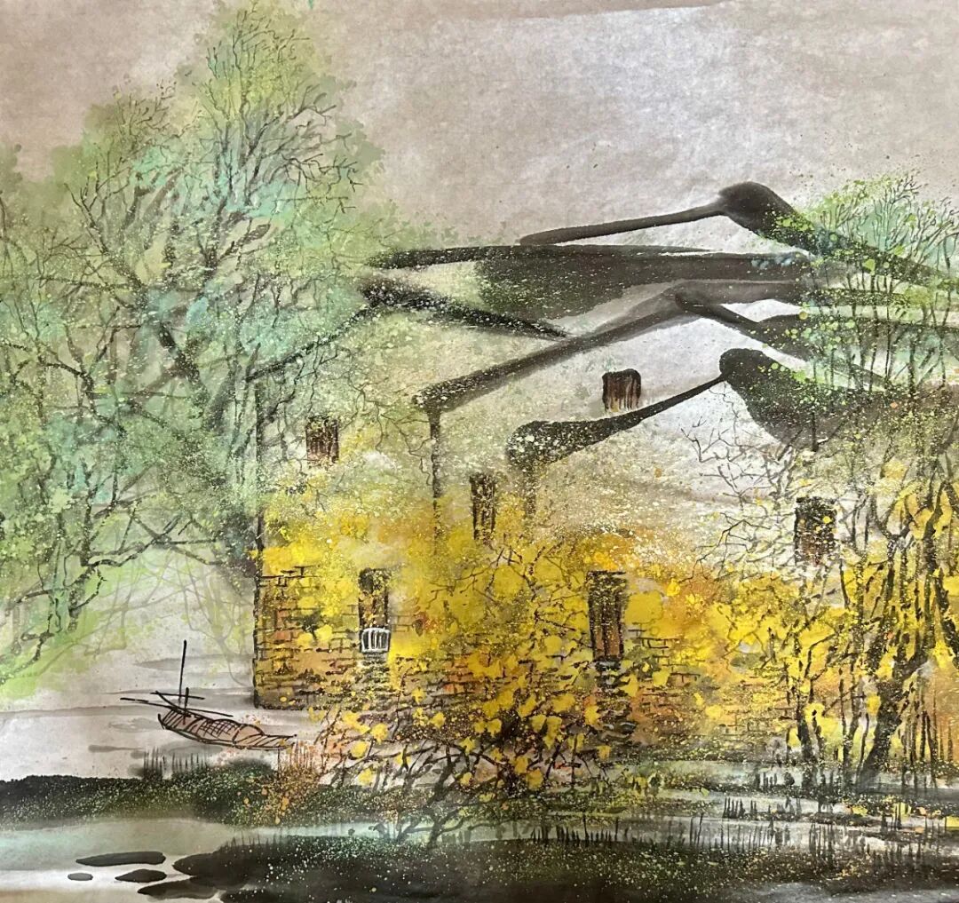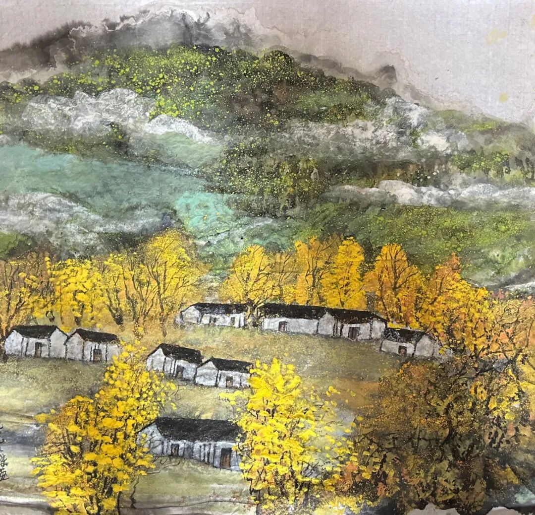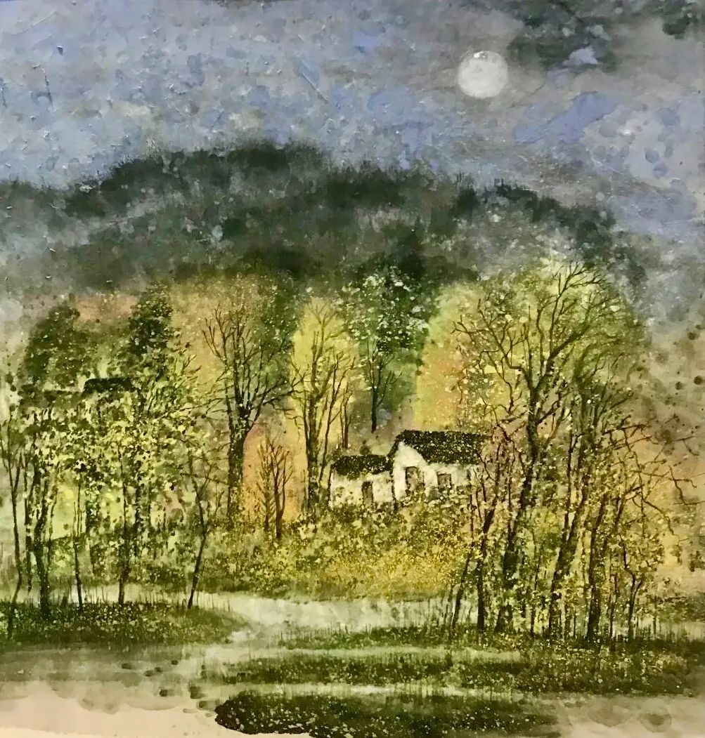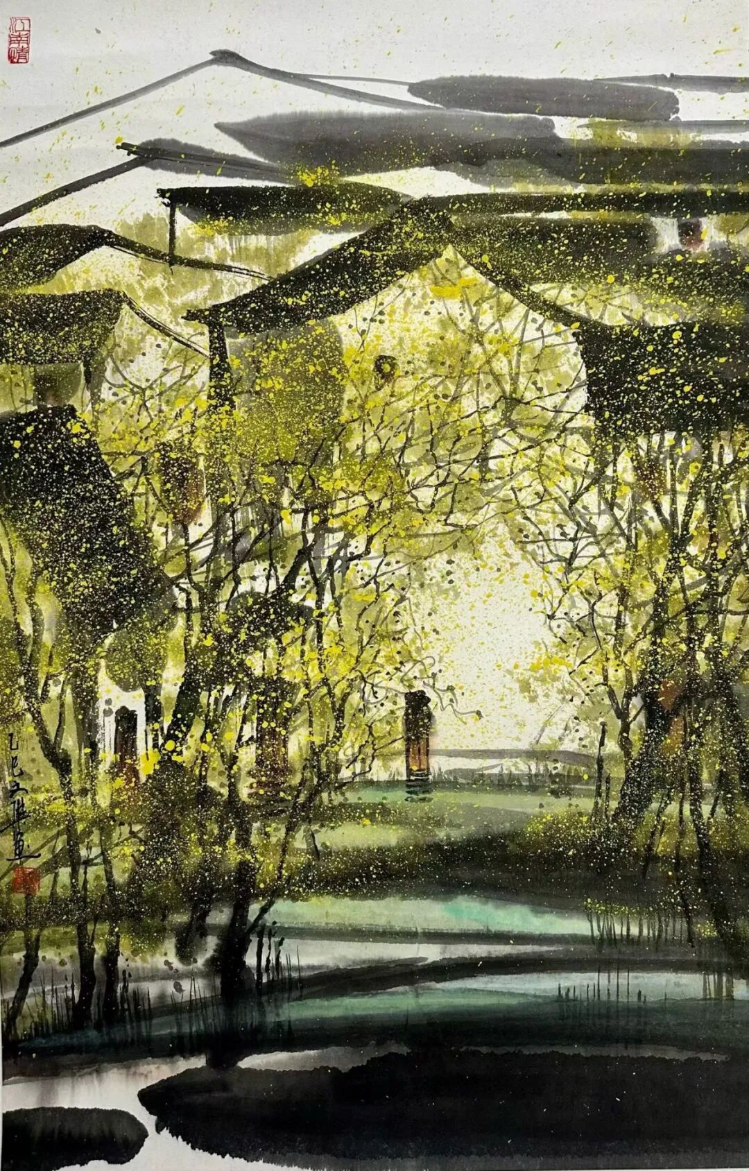他最近又画了许多以江南为题材、以秋色为主调,融合油画的绚烂与水墨的氤氲,用洒彩、泼色、点降、描金等多种实验手段,结合撞墨、破墨、积墨等传统画法,特别注重笔墨之外的水法之运用,画面呈现金黃、深红、墨绿、淡褐等丰富多彩的色彩的和声与交响,把江南的秋色描绘得朗丽多姿,具有典雅的东方美学气息与西方现代构成的意蕴,体现"中西合璧"的艺术理念,晕染、营造出一幅幅朦胧的诗意景象。