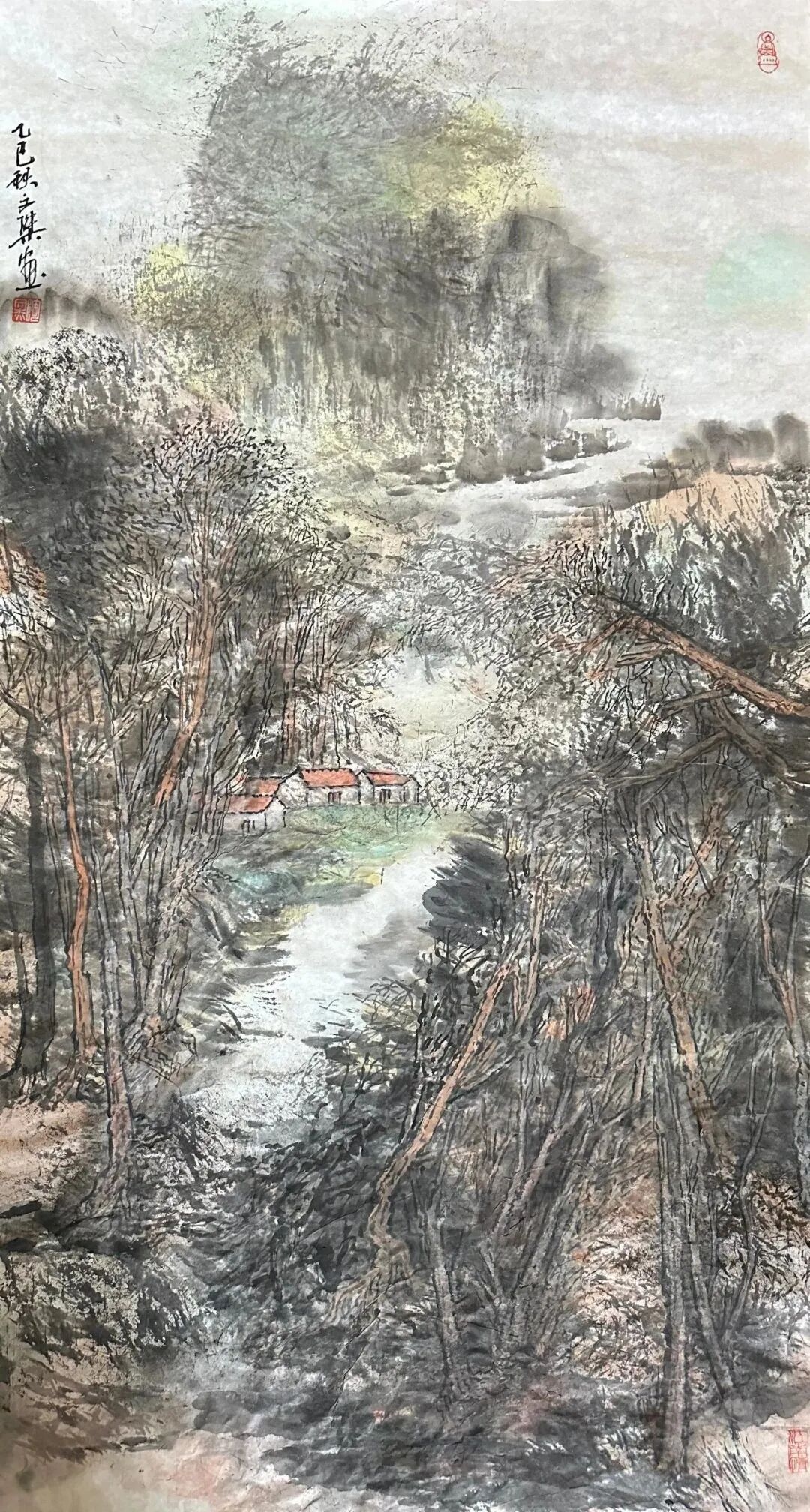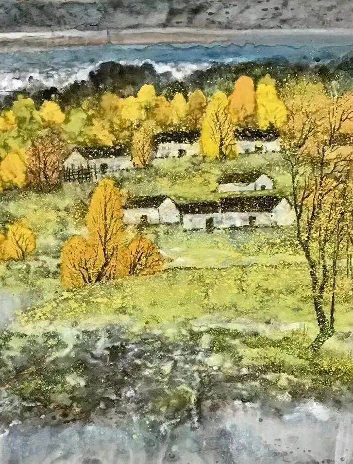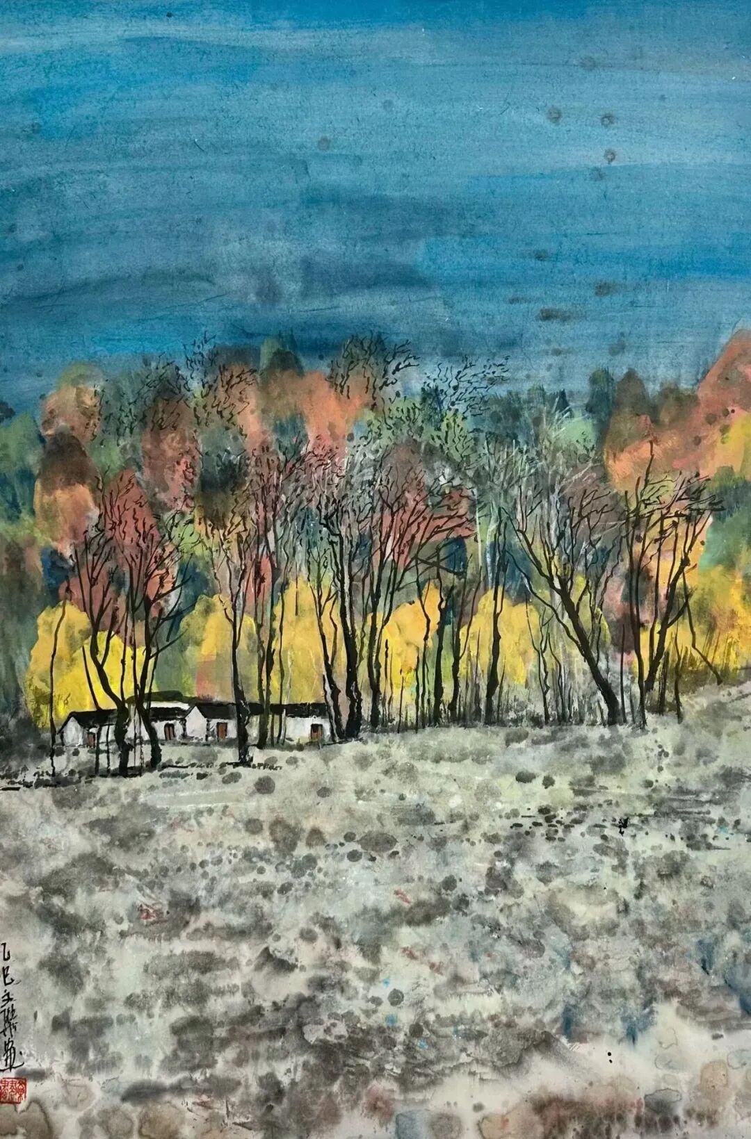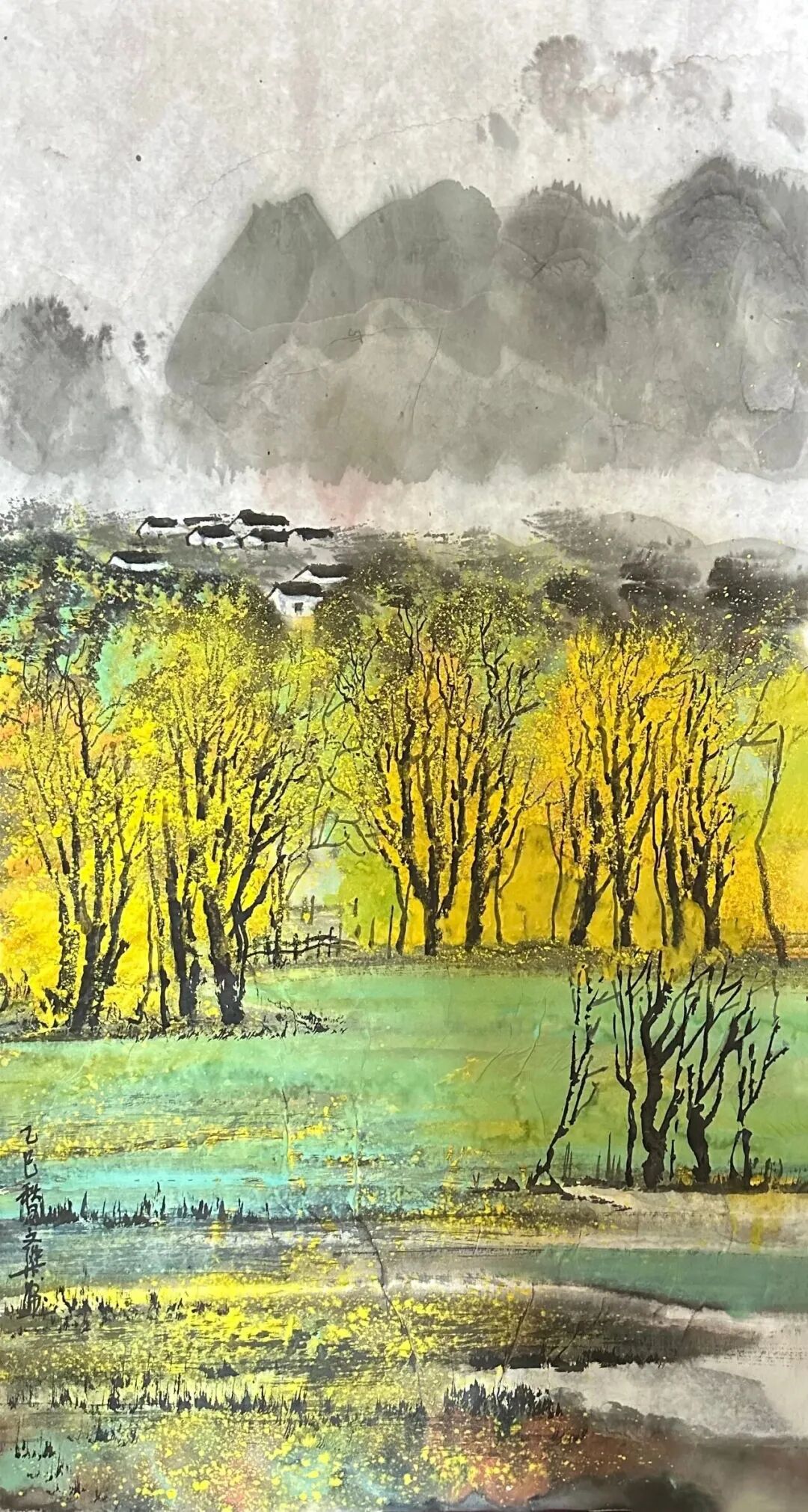他最近又画了许多以江南为题材、以秋色为主调,融合油画的绚烂与水墨的氤氲,用洒彩、泼色、点降、描金等多种实验手段,结合撞墨、破墨、积墨等传统画法,特别注重笔墨之外的水法之运用,画面呈现金黃、深红、墨绿、淡褐等丰富多彩的色彩的和声与交响,把江南的秋色描绘得朗丽多姿,具有典雅的东方美学气息与西方现代构成的意蕴,体现"中西合璧"的艺术理念,晕染、营造出一幅幅朦胧的诗意景象。
