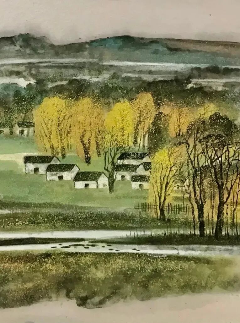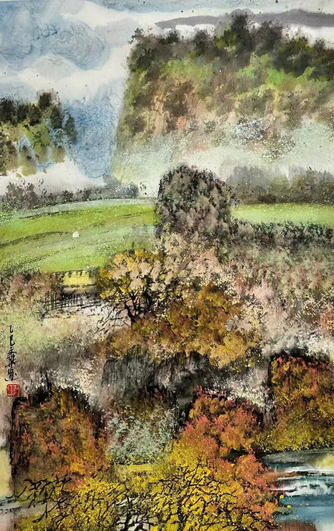 陶文杰爱画江南,有“泼彩挥墨 ,江南一杰”的美誉。他笔下的江南秋色,令人过目难忘。湖渚泽国、小桥流水、空谷新雨、烟云迷濛、村庄篱落、丘陵田园、水映红枫,山衬银杏,一派新江南的气象。