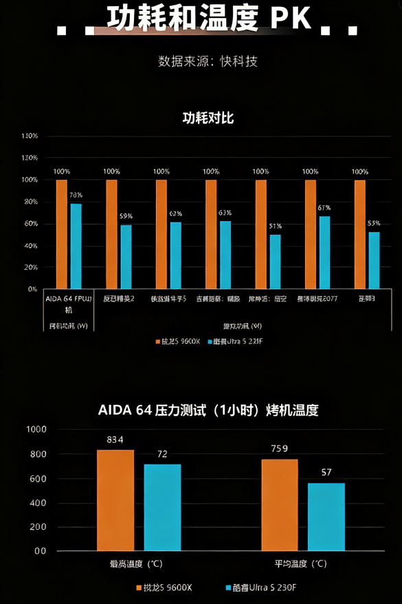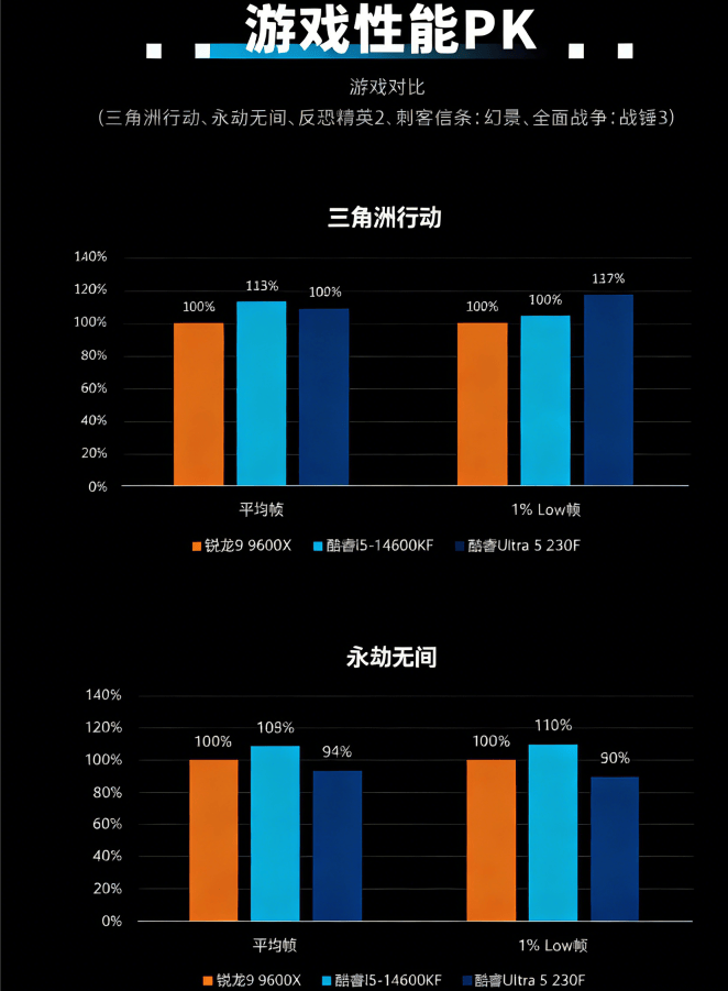 性能方面,也是能抗打的。毕竟喜欢玩游戏的玩家,对于性能还是有点要求的。就拿目前英特尔酷睿Ultra5 230F来说,原本以为它的能效比略高于锐龙5 9600X,而游戏性能则会弱一些。