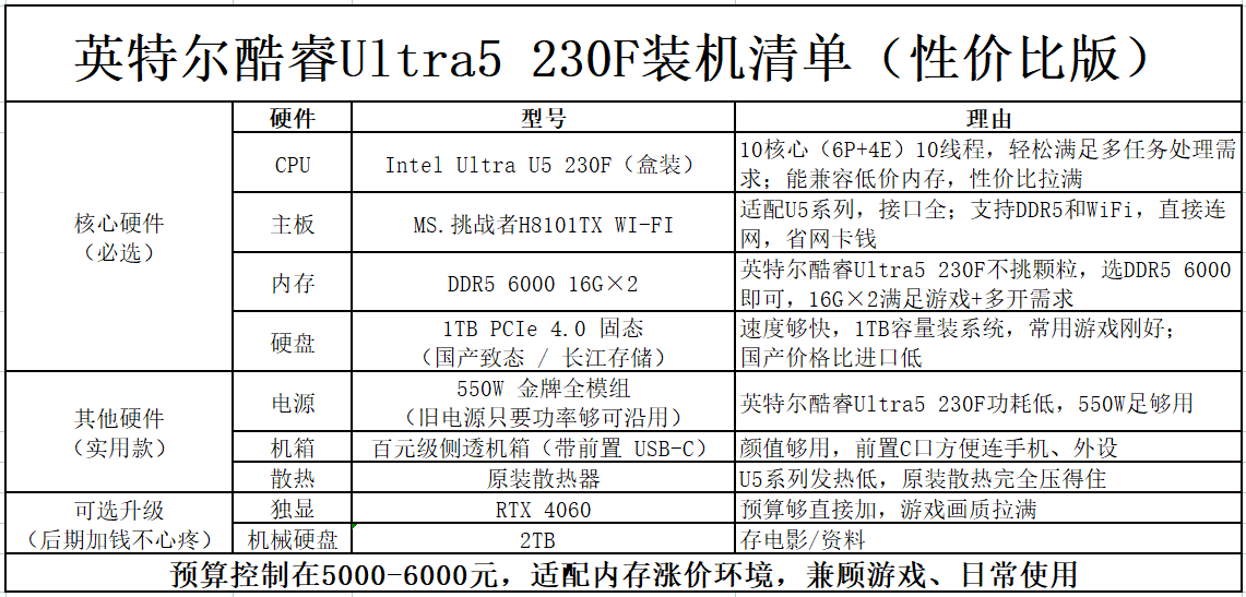 以上的装机清单,可以在入手前看看。如果你也在为装机发愁,不妨看看英特尔酷睿Ultra5 230F,避开内存的坑,而且适合预算有限的人,毕竟把钱花在刀刃上,这才是真正的“真香之选”。
