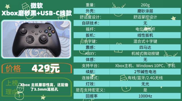 上榜理由:游戏手柄三段式磁吸壳拆装干净利落,握把和正面都能单独替换,搭配配件里的两套十字键盘面,改装空间比较大。摇杆虽然不支持阻尼调节,但4096级高采样+稳定回中让它的准度在同类里挺靠前;动作键和小肩键都用机械微动,声音清脆,连打不累手。扳机用半透明双切结构,短行程打格斗够快,长行程开赛车油门也稳。微软授权带来的好处也能实际感受到,十字键默认力度偏轻,不是特别适合喜欢“硬触发”的格斗玩家,震动细节比普通第三方丰富一档,底部3.5mm耳机孔在射击和竞速游戏里非常实用。