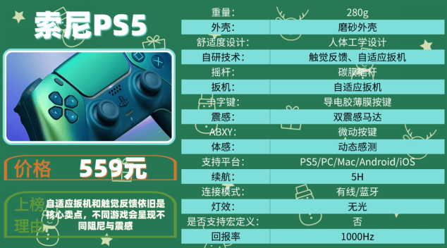 上榜理由:手柄外层用的是细腻的磨砂材质,握在手里既不打滑也不黏腻,长时间游戏下来手指和掌心都不会有疲劳感。按键和摇杆沿用了索尼经典布局,上手没有任何陌生感。自适应扳机和触觉反馈依旧是它最大的卖点——不同类型的游戏会给出完全不同的力道与震动表现,比如赛车中油门的回弹、射击中扣扳机的力度变化,都能清晰传递出来。有一点小小的不足在于,部分场景下扳机阻尼会显得偏紧,个别游戏的震动表现也稍微“用力过猛”,不过整体来说仍然是一种比较独特、也很有沉浸感的体验。