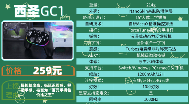 上榜理由:西圣GC1主打“平价享高端操控”,定价控制在百元级,却能带来接近中高端手柄的精准响应与稳定手感。西圣团队长期为多家全球知名厂商提供交互方案与无线技术支持,专业能力毋庸置疑。产品上市后迅速在玩家圈与数码媒体中引发关注,凭借出色的操控体验与极高的完成度,成为百元档游戏手柄里性价比最突出的选择。