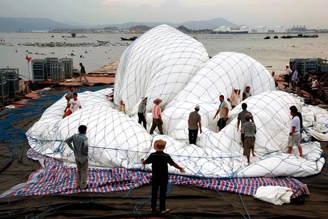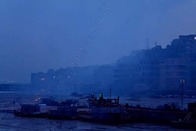 那是一个寻常的凌晨,渔排上的灯火还未熄灭,直径25米的气球缓缓升空,500米长、5.5米宽的“梯子”借着烟花的光,像一条通往宇宙的通道。150秒后,光带消散,却成了惠屿岛村民口中“一辈子难忘的场景”。
