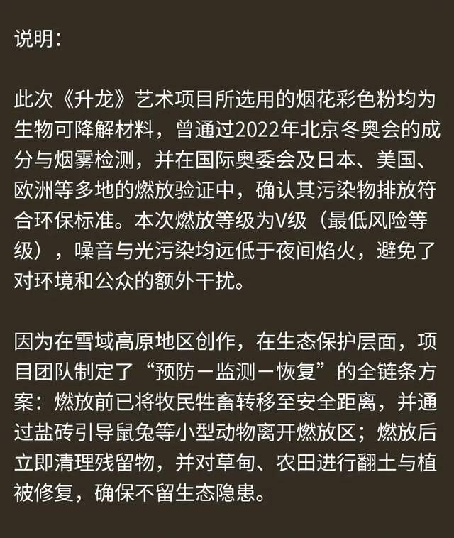 当第一簇火药在夜空炸开,蔡国强与始祖鸟合作的《升龙》艺术项目,试图用三幕爆破勾勒出“龙”的轮廓——这个承载着东方文化“吉祥”与“生生不息”寓意的符号,在高原星空下只停留了短暂的瞬间,却在艺术与生态的思辨中掀起了绵长的争议。