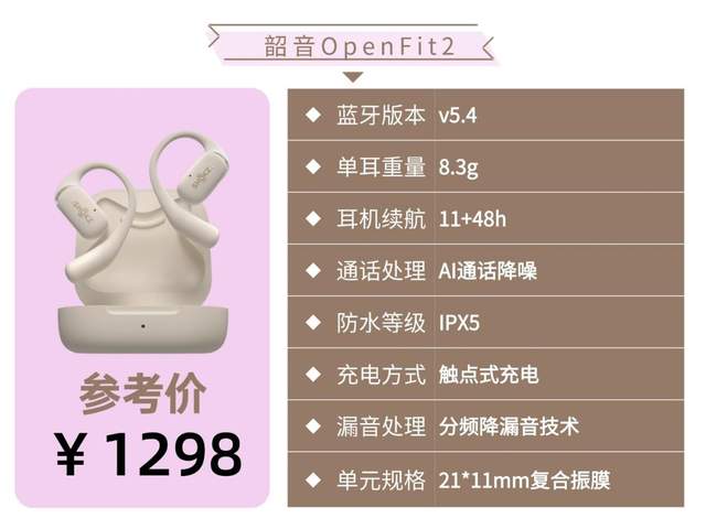 韶音这款耳机的通话处理方式是AI通话降噪,打电话时对方听得清清楚楚,沟通效率大幅提高;佩戴舒适度更是没话说,耳挂采用海豚弧形设计,搭配超零度硅胶材质,单耳仅8.3g的重量,既能紧密贴合耳型,长时间佩戴也毫无压迫感。音质表现同样亮眼,搭载双引擎技术,把音乐里的各种细节都展现得淋漓尽致。续航方面也相当给力,总续航长达48小时,日常通勤、运动健身完全够用。