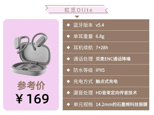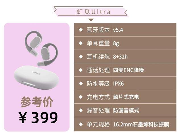 虹觅这款耳机内置四个麦克风,搭载了ENC通话降噪技术,打电话的时候对方可以听得很清晰;机身采用流线型设计,完美贴合耳型,单耳仅8g的重量,搭配亲肤柔软的液态硅胶材质,佩戴舒适度直接拉满。它还配备自研防漏音模式,开启后漏音情况大幅改善,即便在安静环境下使用,也不用担心吵到身边人。耳机防水等级达到IPX6,运动时大汗淋漓也完全不怕,简单擦拭后就能继续使用。此外,虹觅还创新采用触片式充电的方式,充电效率极高,临出门前快速补电,就能满足一整天的使用需求。