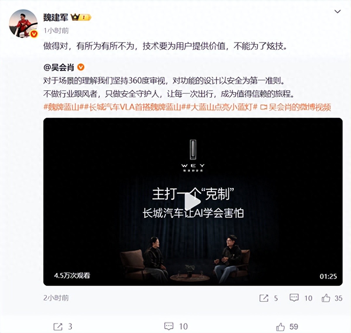 对此,魏建军转发并表示:“有所为有所不为,技术要为用户提供价值,不能为了炫技。”