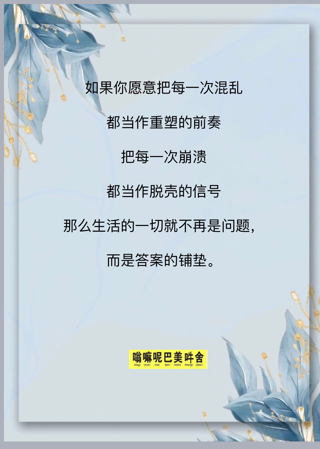 如果你愿意把每一次混乱,都当作重塑的前奏,把每一次崩溃,都当作脱壳的信号,那么生活的一切就不再是问题,而是答案的铺垫。