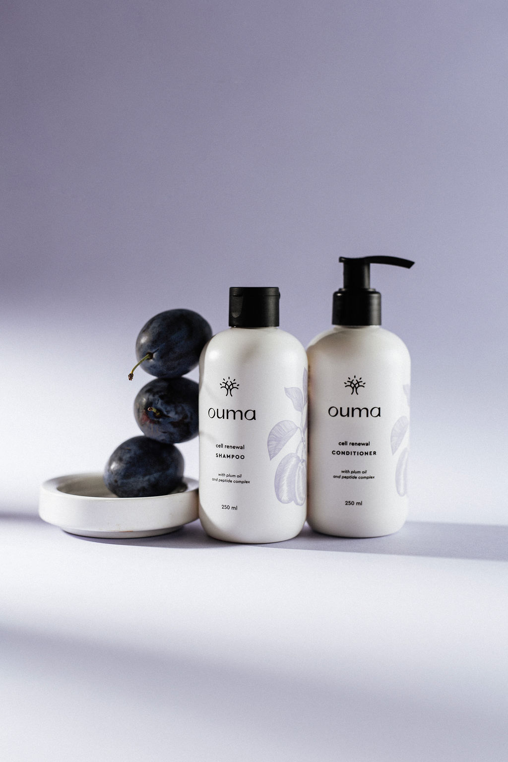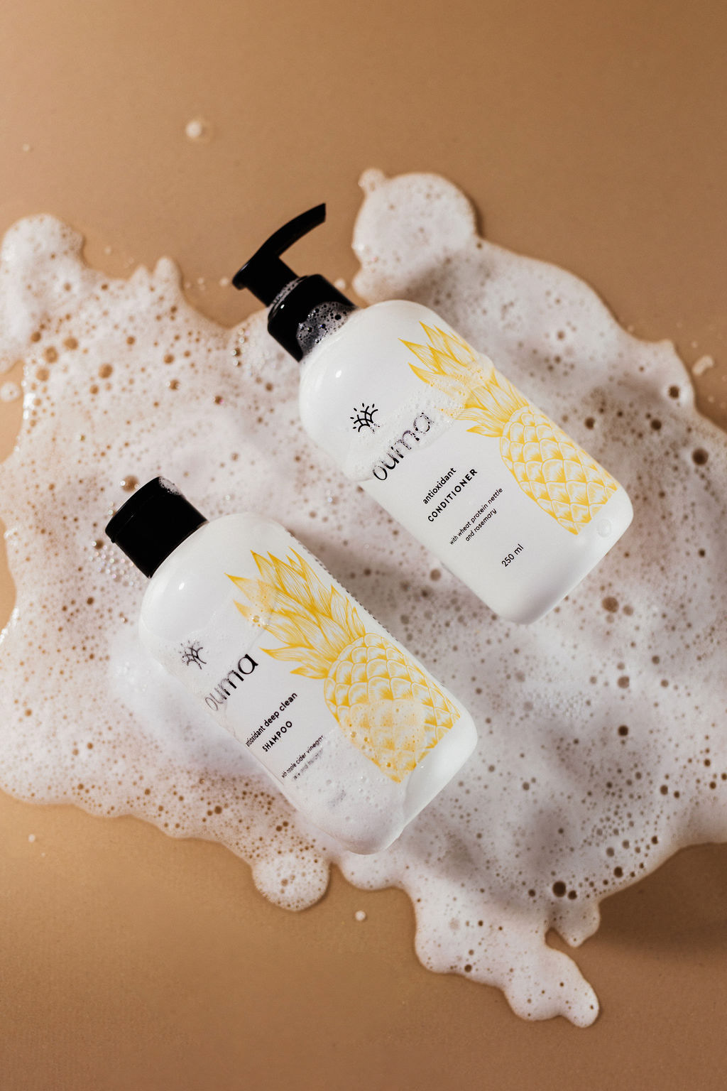 以纯白瓶身为基底,用菠萝、叶片等手绘植物图案作为视觉核心,明快的黄、柔和的紫、清新的绿分别对应不同系列,色彩既是视觉亮点也是功能区分的符号;黑色极简 Logo 搭配小巧的太阳形符号,在手绘的繁与 Logo 的简之间形成平衡,让包装自带 “天然治愈” 的氛围感,一眼就能打动追求清新感的消费者。