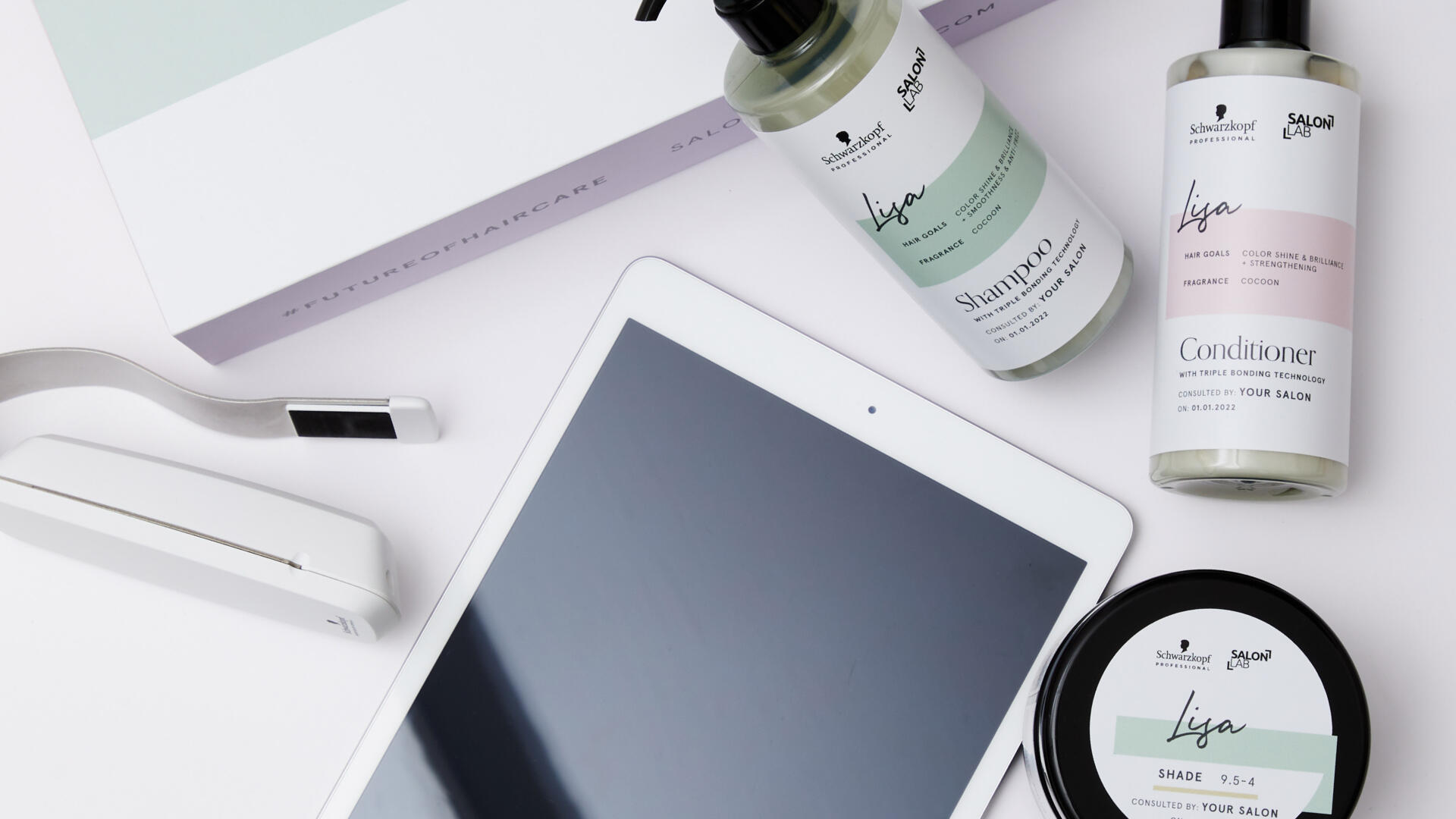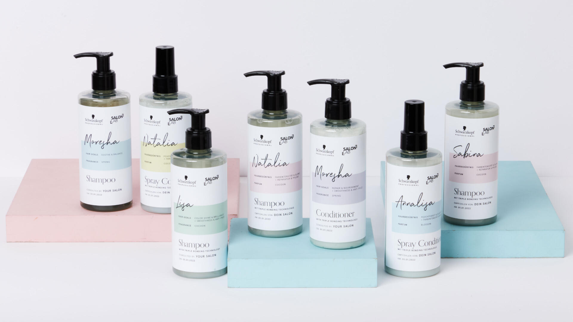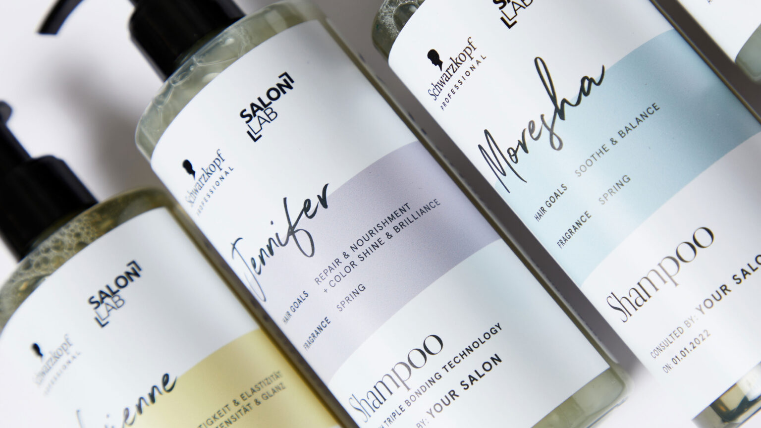 透明瓶身搭配纯白标签,用马卡龙色系的浅蓝、浅粉、浅绿做色块区分,既保持视觉统一又能快速识别产品功能;最吸睛的是手写体的个性化名字,加上 “CONSULTED BY YOUR SALON” 的专属感文案,让用户拥有 “定制级洗护” 的仪式感;“SALON LAB” 的黑体 Logo 与Schwarzkopf的标识相呼应,在极简设计中传递专业沙龙级的品质感。