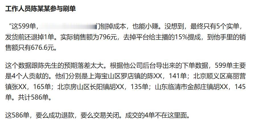 最终一共成交599单,不过只有5单是真实订单,而且发货之前还被退掉1单,其他订单都是刷出来的。