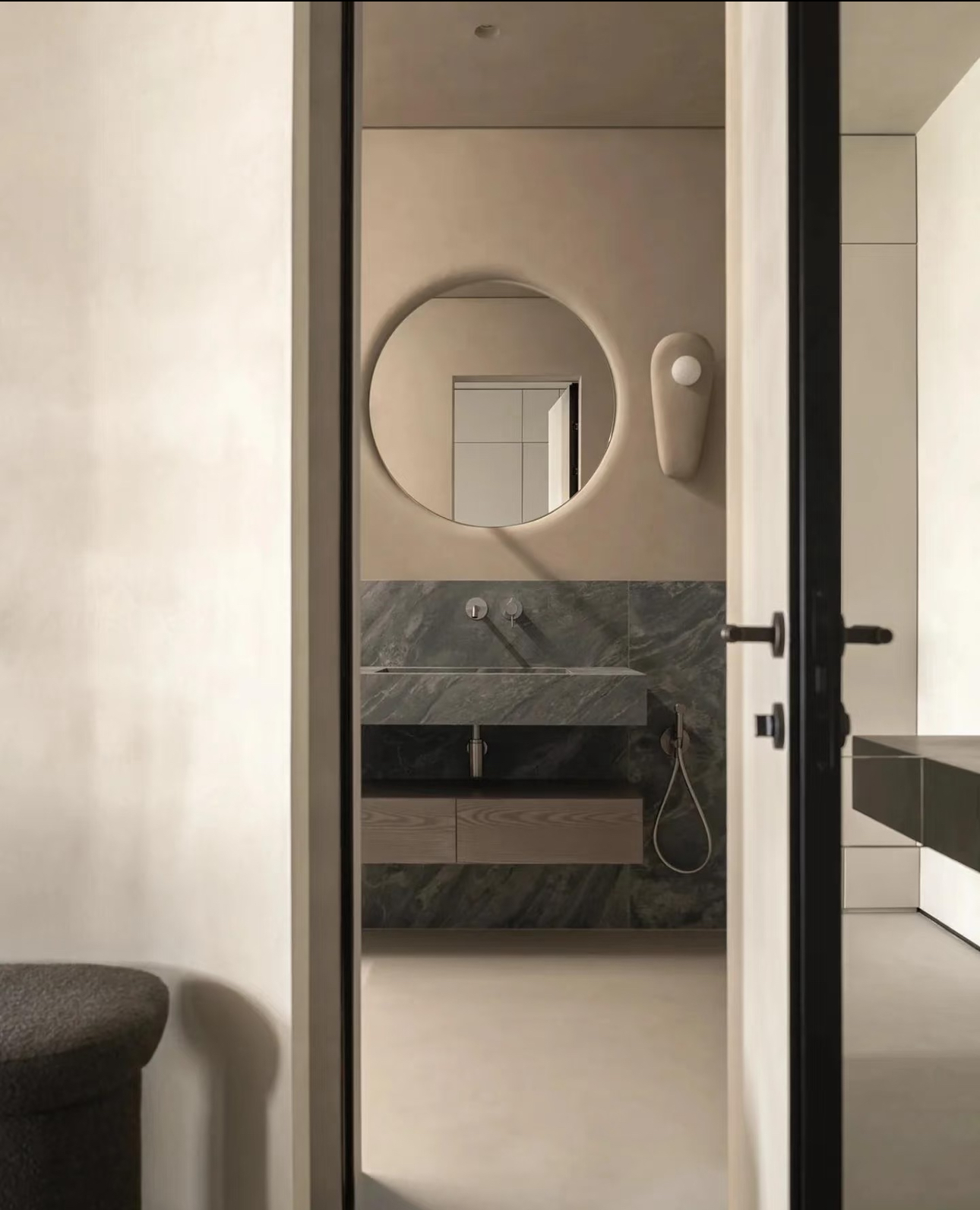 这种源自欧洲的最新墙面系统,通过独特的工艺和材料配比,实现了从墙面到地面,从室内到室外的完美过渡。 突破传统材质的界限 传统装修中,不同空间的过渡往往通过踢脚线、收边条、门槛石等元素进行分割,这些必要的"接口"虽然解决了材质转换的技术问题,却不可避免地破坏了空间的整体性。