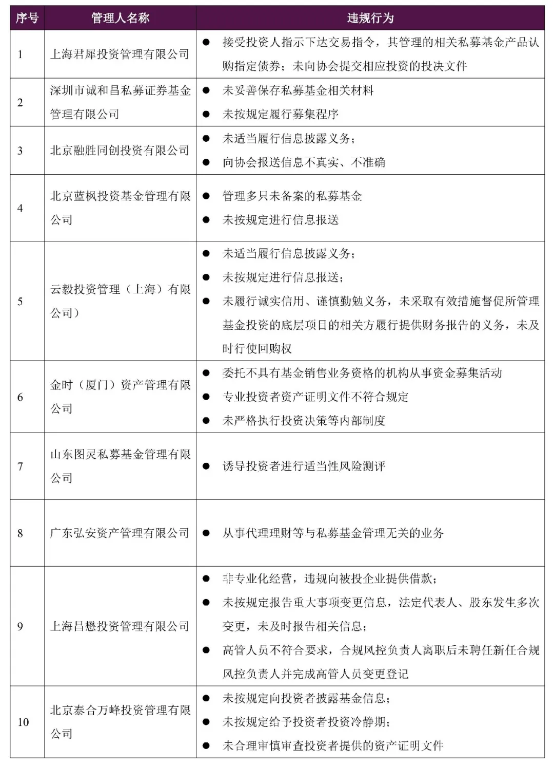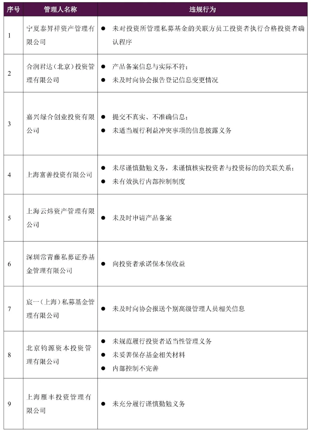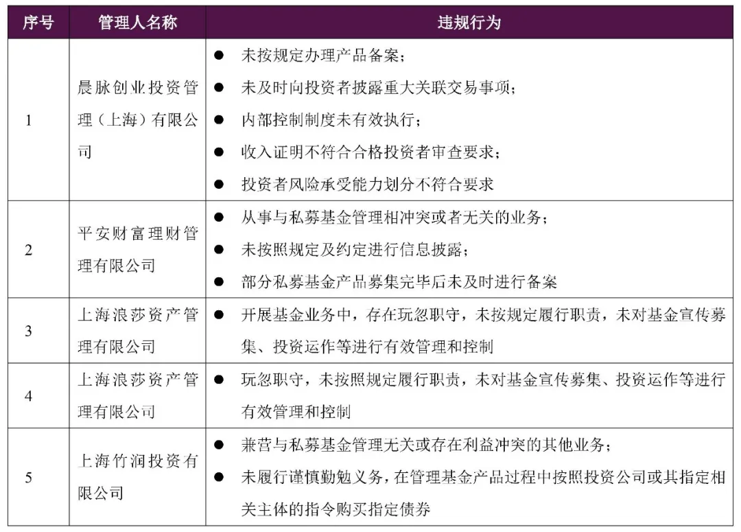 从被处分机构的具体违规行为来看,基金业协会纪律处分重点聚焦于以下几类问题:一是管理人失联、高管及员工缺失、办公场所等不符合登记要求、未及时提交重大事项变更、登记信息失实等主体资格缺陷;二是向非合格投资者募集、承诺保本保收益、未落实适当性管理、违规外包销售、宣传推介不实等募集行为违规;三是挪用基金财产、开展通道业务及利益冲突业务、违规违约投资运作和进行利益输送等侵害投资者权益的行为;四是未建立健全和有效执行内部控制、制度缺失或形同虚设、岗位设置混乱、文件资料保管不善等内部治理违规;五是对投资者信息披露失责、监管信息报送失准和不配合自律检查等信息披露违规。我们理解,本年度的处分案例共同传递出基金业协会净化行业生态的坚定信号,也为各类私募基金管理人筑牢合规防线、实现规范发展提供了清晰的实践指引。