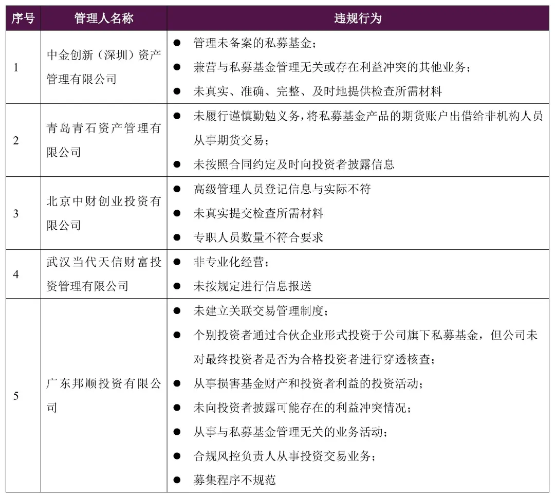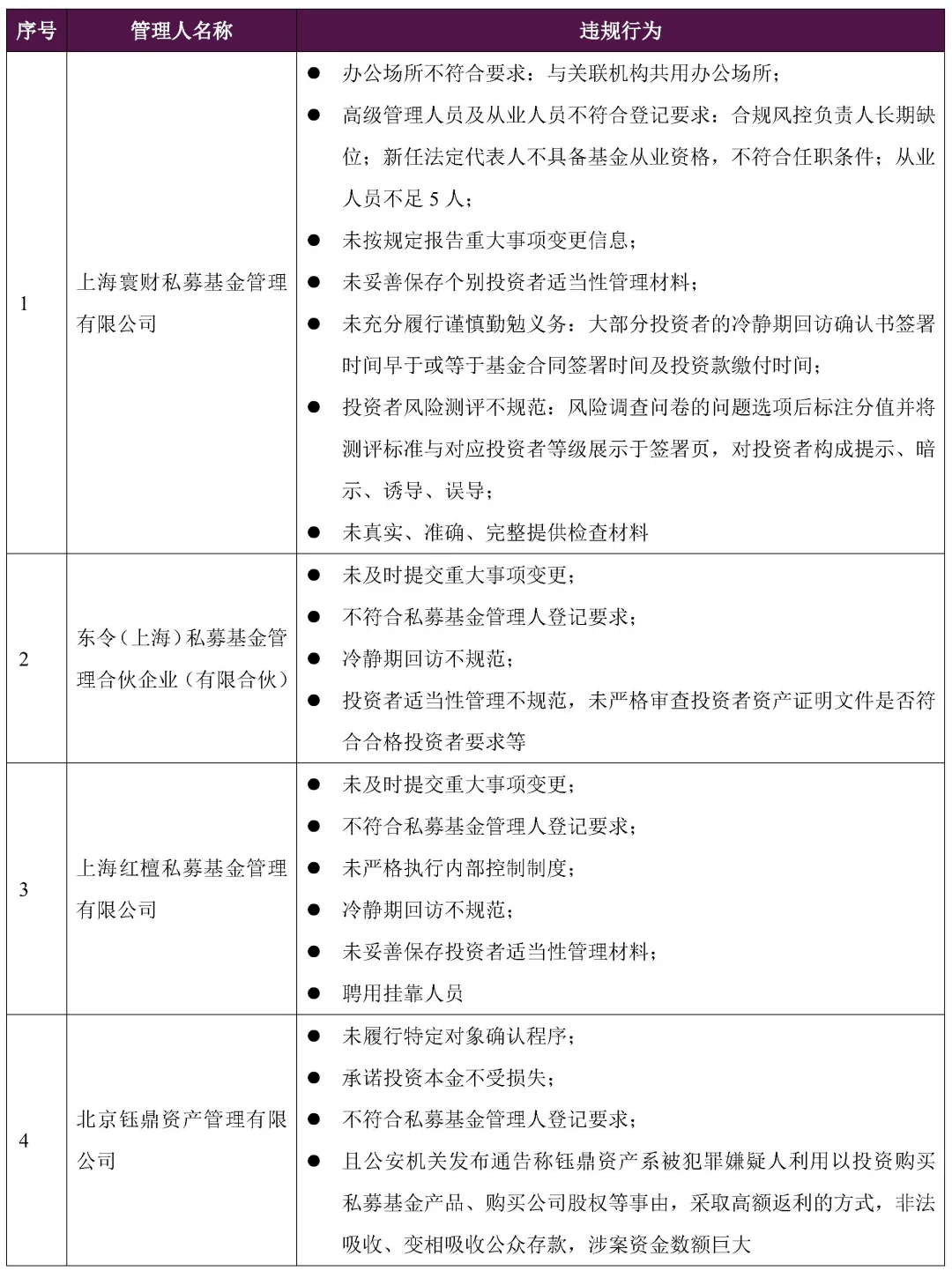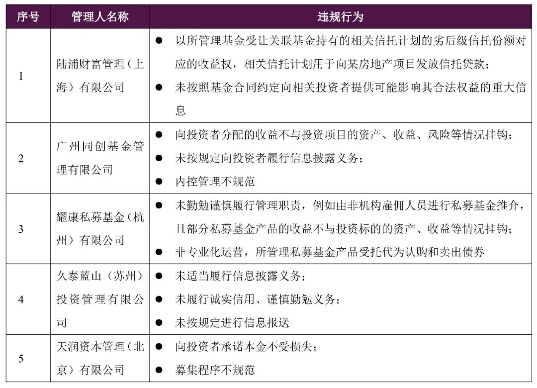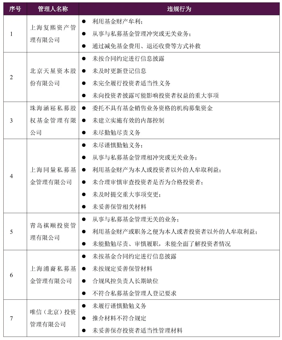 从被处分机构的具体违规行为来看,基金业协会纪律处分重点聚焦于以下几类问题:一是管理人失联、高管及员工缺失、办公场所等不符合登记要求、未及时提交重大事项变更、登记信息失实等主体资格缺陷;二是向非合格投资者募集、承诺保本保收益、未落实适当性管理、违规外包销售、宣传推介不实等募集行为违规;三是挪用基金财产、开展通道业务及利益冲突业务、违规违约投资运作和进行利益输送等侵害投资者权益的行为;四是未建立健全和有效执行内部控制、制度缺失或形同虚设、岗位设置混乱、文件资料保管不善等内部治理违规;五是对投资者信息披露失责、监管信息报送失准和不配合自律检查等信息披露违规。我们理解,本年度的处分案例共同传递出基金业协会净化行业生态的坚定信号,也为各类私募基金管理人筑牢合规防线、实现规范发展提供了清晰的实践指引。