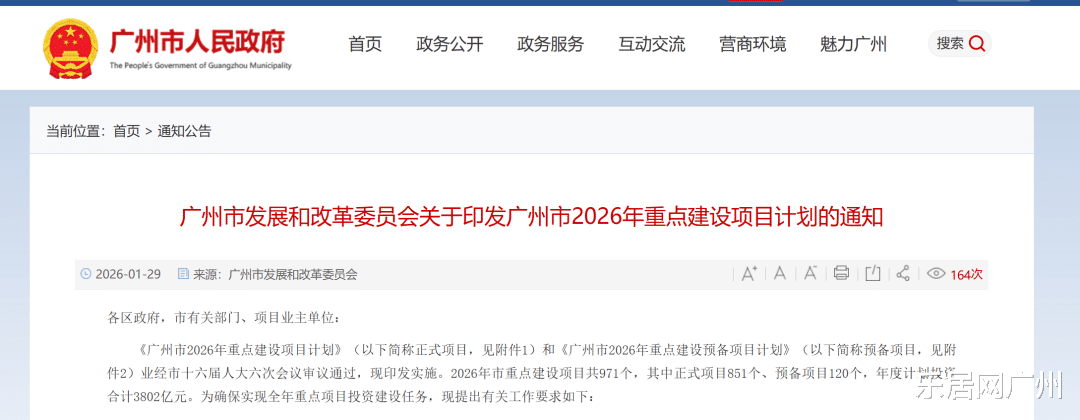 近日,广州发改委甩出一份"重磅炸弹",《广州市2026年重点建设项目计划》。这份清单的分量,比往年都要重:共涉及重点项目971个,年度计划投资合计3802亿!