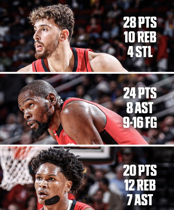 火箭三巨头今天都非常给力,连续第二场同砍20+。申京十分给力,出战30分钟,20投11中,三分1中0,罚球7中6,砍下28分10篮板3助攻4抢断。第四节比赛,申京8投6中单节轰下14分。本赛季至今,申京场均也能贡献23.1分9.1篮板6.6助攻的全面数据。