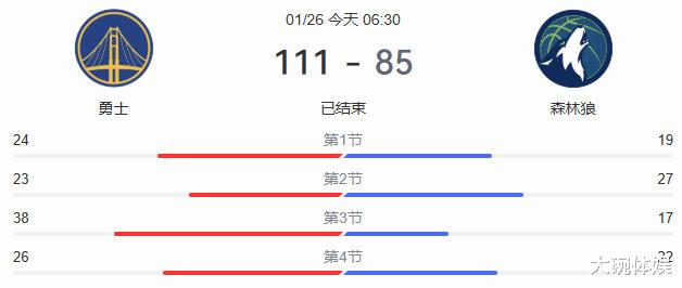 北京时间1月26日,NBA常规赛焦点战,勇士客场挑战森林狼,最终以111-85大胜对手,成功终结自身2连败,同时送森林狼遭遇耻辱5连败。