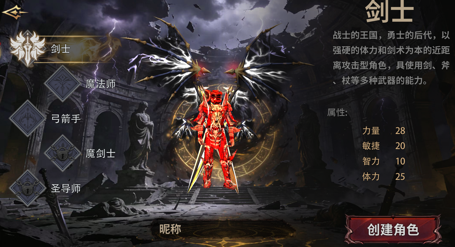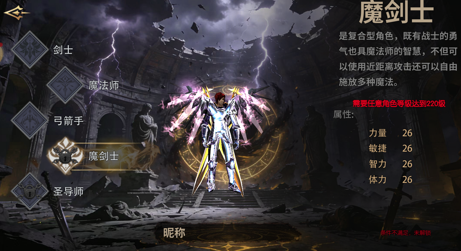 创建条件:需要拥有一个等级超过220级或以上的角色或使用职业卡方可创建转职路线:魔剑士一剑圣(Lv400)一魔骑士(Lv800)一双星骑士(Lv1200)