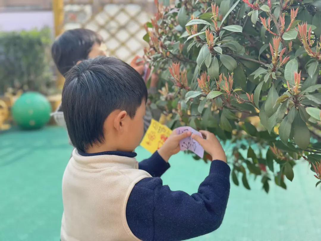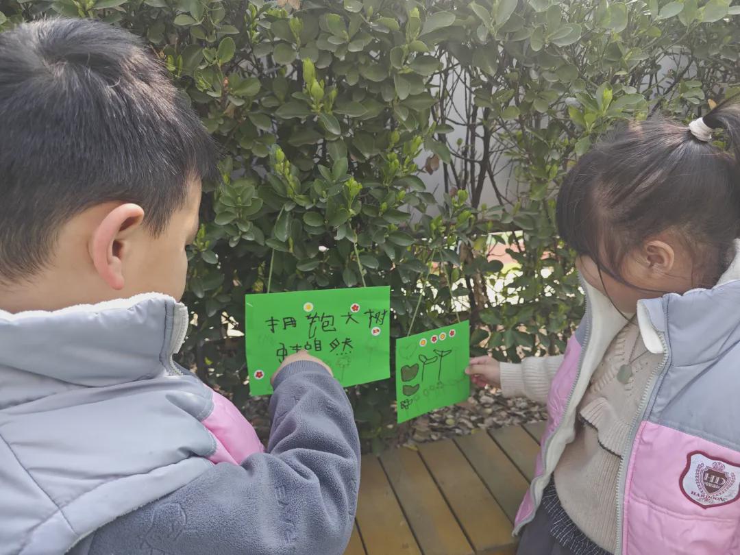 大班孩子动手能力较强,他们充分发挥想象为小树来设计“名片”,孩子们一个个跃跃欲试兴奋极了,最后把设计好的“名片”挂到每一棵小树上,成为幼儿园里一道亮丽的风景线。