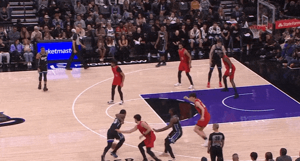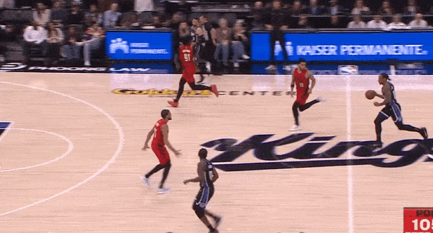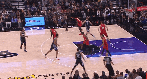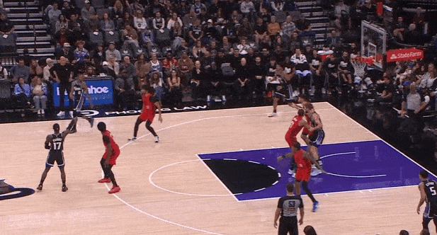 蒙克无球跟进转换进攻落位至左翼拉开,接德罗赞突破回传大空位三分手起刀落。