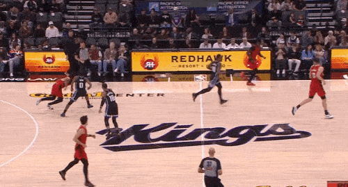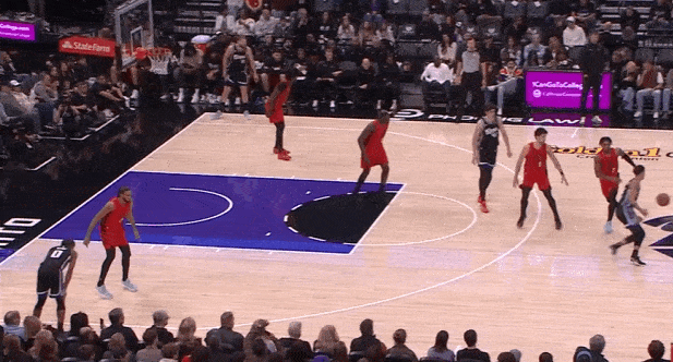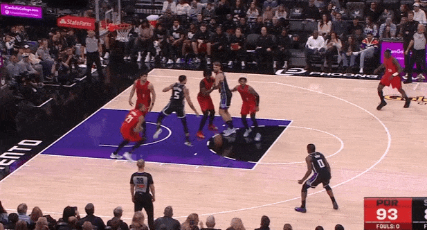 蒙克趁防守人不备底角启动弧形跑位切入篮下,摆脱防守人后接施罗德人到球到传球双手挂框暴扣。