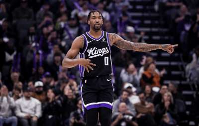 蒙克和威少合力抢断夏普后立即奔向前场,跳起接德罗赞长传上球,立即炸球衔接后撤步拉回至三分线外出手持球三分。