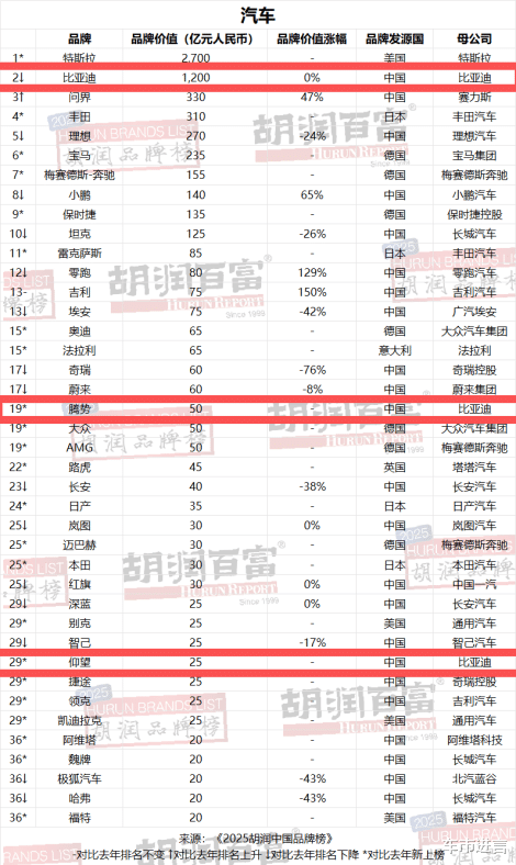 近日,2025年《胡润汽车品牌榜》正式揭晓,中国新能源汽车领军企业——比亚迪,再次以显著优势摘得中国汽车品牌价值第一的桂冠,这也是比亚迪四度登顶这一荣耀。并且本次榜单在评选规则上迎来重要调整,首次将在中国市场活跃的非国产品牌纳入评价体系,使得榜单更具行业广度与市场参考价值。