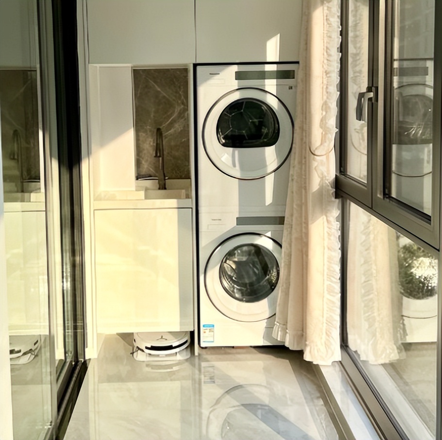 家里面的阳台打造一个洗衣区,下面装洗衣机,上面装烘干机,组合式的不占地方还好用。