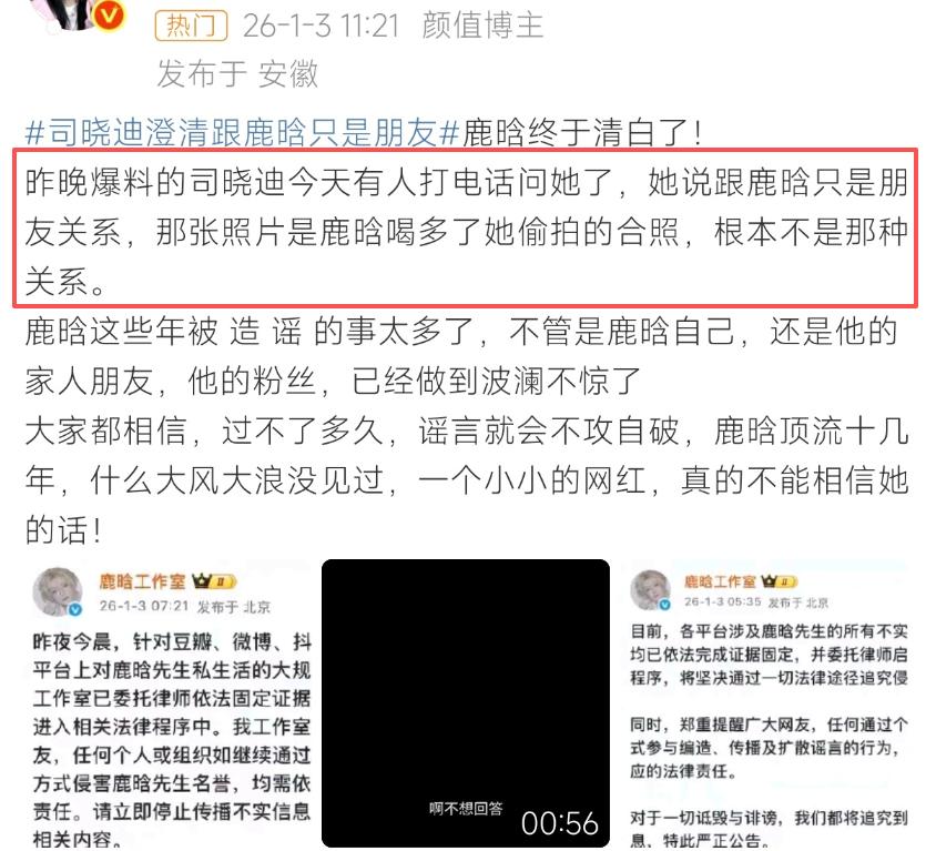 不过1月3日中午,司晓迪给鹿晗辟谣了,说两人只是朋友,她是趁对方喝醉偷拍的。