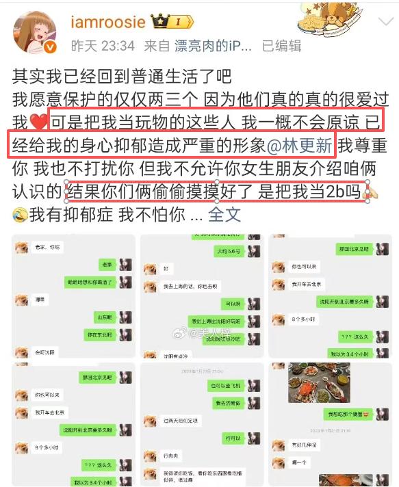 通过聊天可知,两人在2022年和2023年关系很好,但后来林更新背着她和她的闺蜜好上了,于是她生气了。