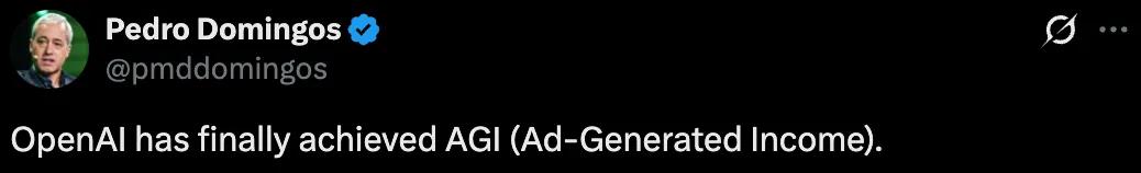 华盛顿大学教授荣誉退休教授、知名 AI 学者 Pedro Domingos 吐槽道:OpenAI 终于实现了 AGI,不过此 AGI 非彼 AGI,而是 Ad-Generated Income.