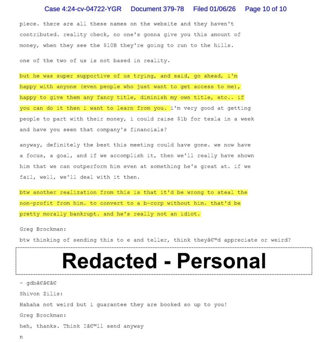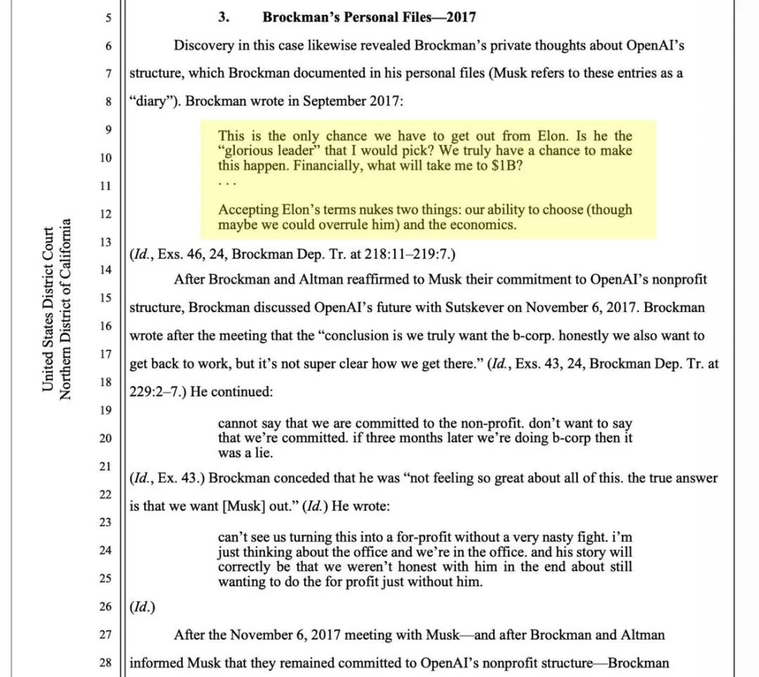 这些记录显示,Brockman 曾在日记中写道:「这是我们摆脱 Elon 的唯一机会…… 从财务角度,什么才能让我达到 10 亿美元?」并讨论转向营利结构,以避免马斯克的控制「破坏经济利益」。