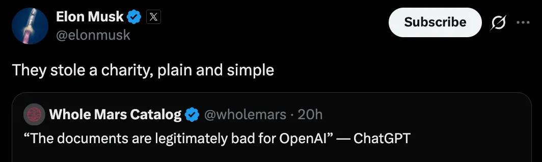 马斯克在 X 上直接评论:「他们偷了一个慈善组织,就这么简单。」