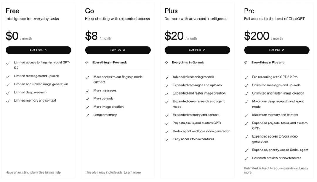ChatGPT Go 是他们的低价订阅计划,每月 8 美元,提供比免费版多 10 倍的消息额度、文件上传和图像生成功能、更大的内存、更长的上下文窗口,以及可以无限使用 GPT 5.2 instant 模型。