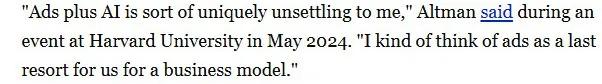 在奥特曼介绍 ChatGPT 广告的推文下,有网友还扒出了 2024 年 5 月奥特曼在哈佛大学演讲里的内容,当时他说:广告对我们来说是一种商业模式的最后选择。