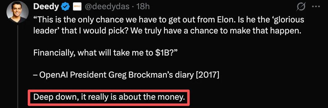 关于双方的纠葛,MenloVentures 合伙人 Deedy 的评论一针见血:说到底,这一切都和钱有关。