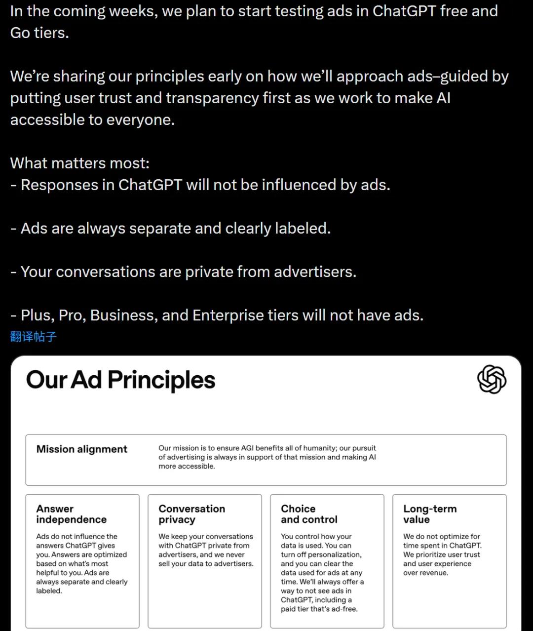 OpenAI 承诺广告商无法影响 ChatGPT 生成的答案内容,此外,用户的具体对话内容不会被直接发送给广告商,只会用于匹配相关性。