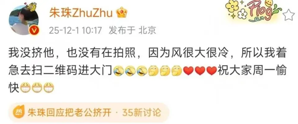 可反转来得比风还快!12月1日朱珠直接在微博开腔,语气干脆利落:“我没挤他,也没有在拍照,因为风很大很冷,所以着急去扫二维码进大门”,末尾还补了句“祝大家周一愉快”。一句话戳破所有过度解读,网友才反应过来:哪是什么抢镜,明明是冻得急着进门!
