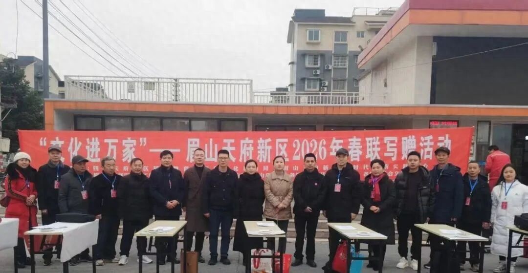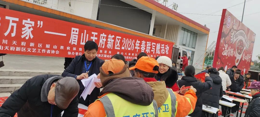 1月20日,眉山天府新区青龙街道邻里中心广场,墨香萦绕,人声鼎沸,暖意涌动。由四川天府新区眉山教育体育和文化旅游局、眉山天府新区融媒体中心、眉山天府新区新时代文明实践中心主办,眉山天府新区文艺工作者协会承办,四川天府新区眉山总工会,各镇(街道)新时代文明实践所、综合文化站(分站)协办的“文化进万家”2026年春联写赠活动,在此热烈举行,这也正式拉开了新区2026年迎春文化惠民活动序幕。
