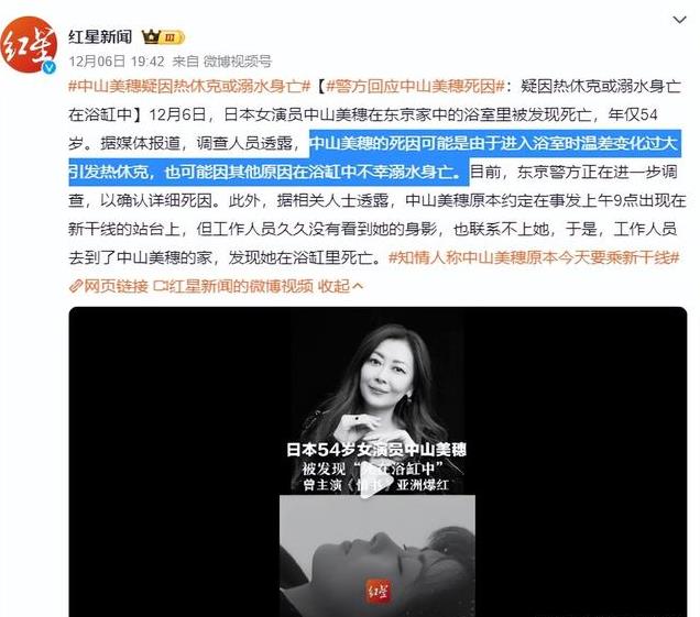 没想到,54岁的中山美穗居然以这样的方式与世人告别,关于其去世的原因,调查人员发现,或与进入浴室内时温差变化过大引发的热休克,也可能是因为其他原因在浴缸中不幸溺水身亡。