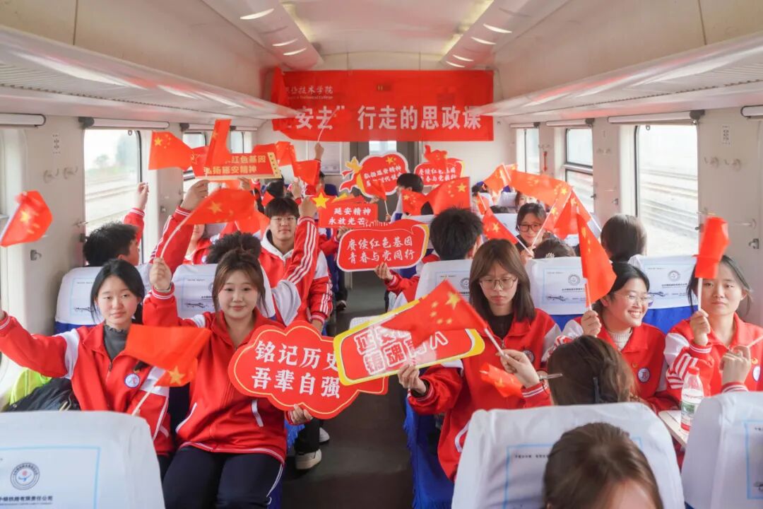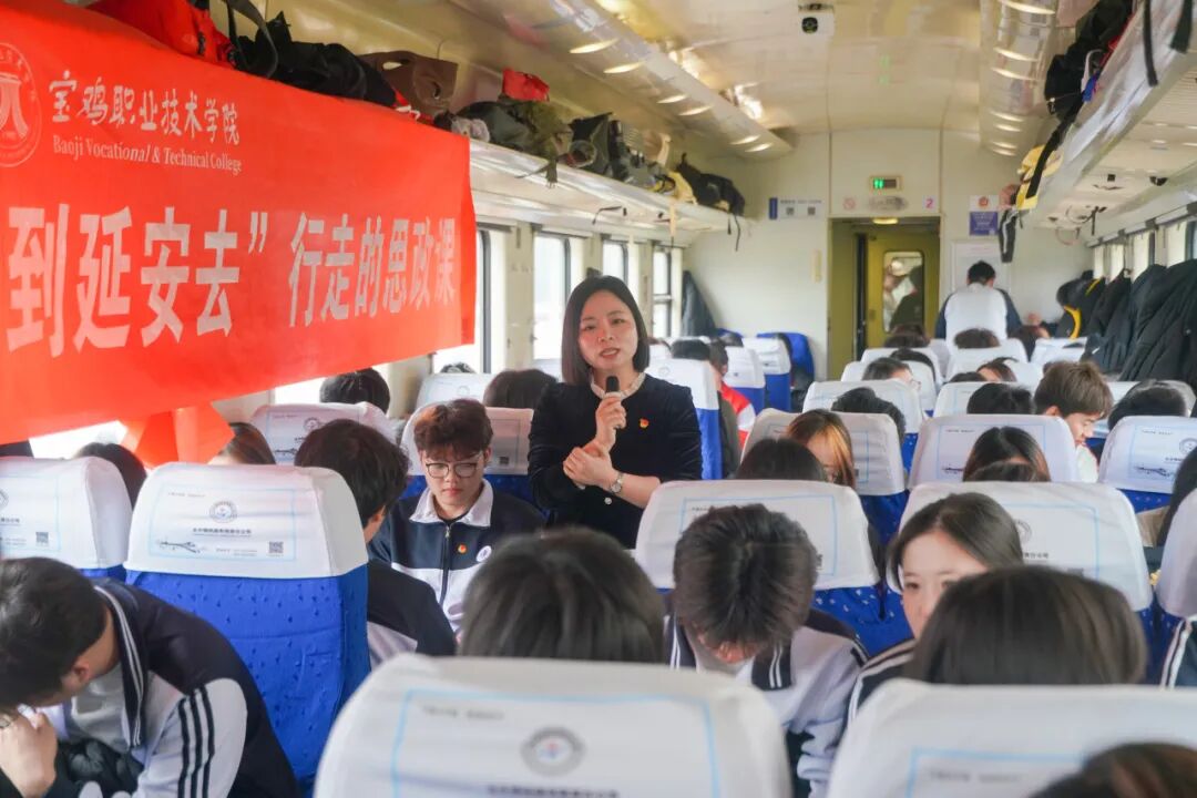 当清晨的第一缕阳光洒向黄土高原,宝职学子已踏上前往延安的旅程。车轮向前,火车上的课堂也同步启动。学院教师深入阐释延安精神的形成背景与时代价值,并精心设计互动环节,激发学子对延安的无限向往。一句“风在吼,马在啸,黄河在咆哮”瞬间点燃车厢氛围,同学们齐唱红歌,在沉浸体验中与革命先辈展开“跨时空对话”,真切感受延安精神的温度与力量,提前浸润在延安精神的浓厚氛围中。