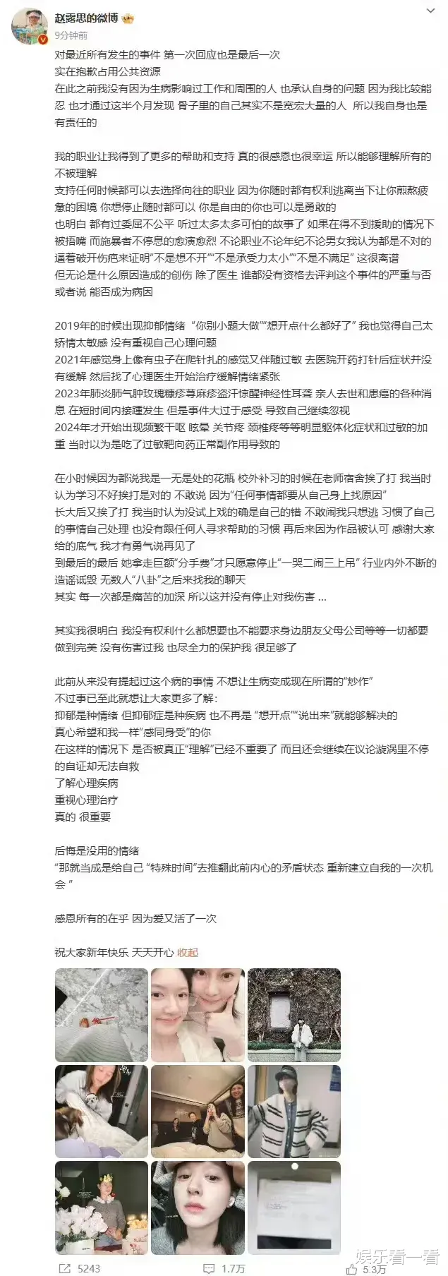 1月1日,赵露思的社交账号恢复正常,她对最近的事情和自己的身体状态发长文回应。