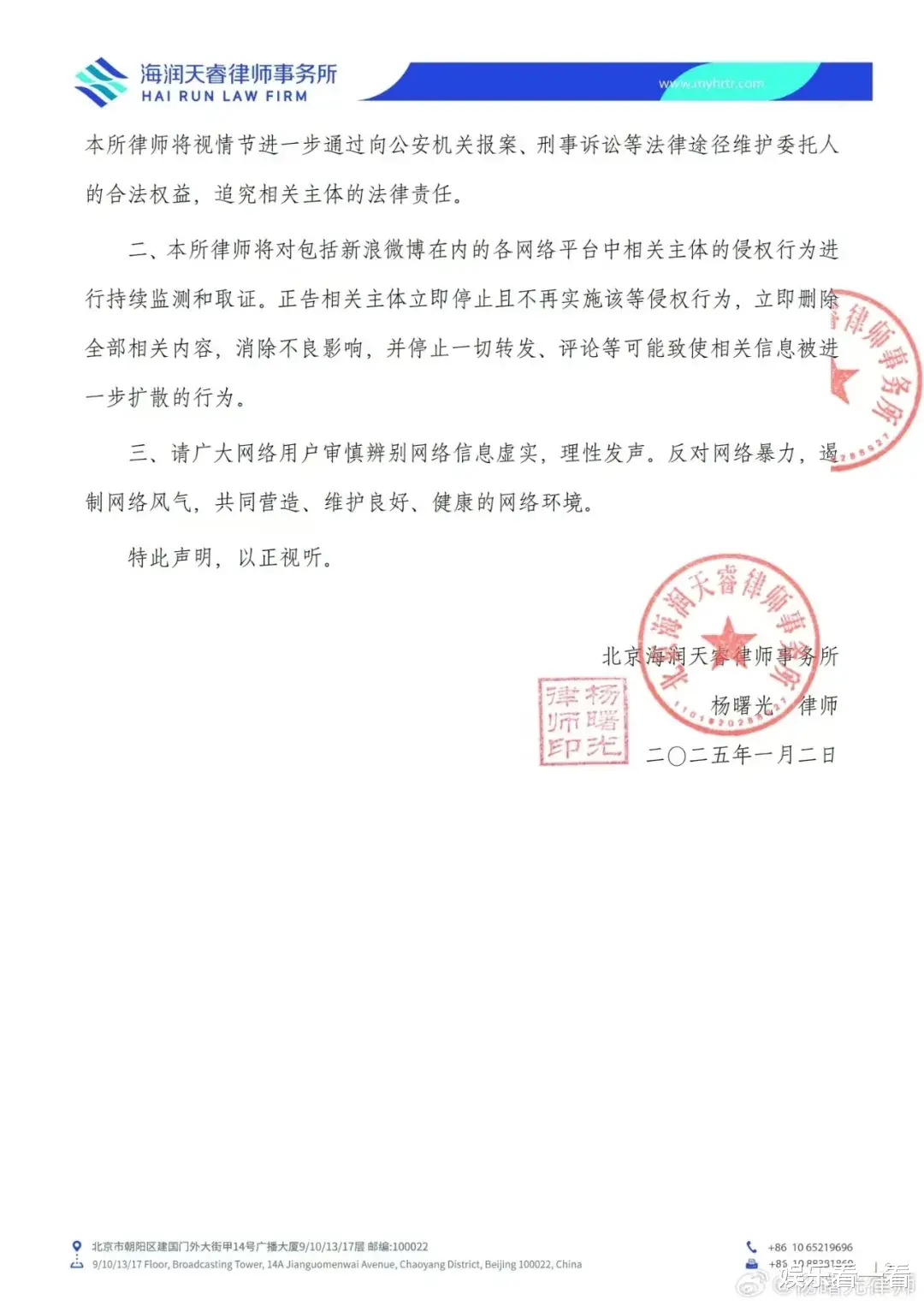 律师声明称,“徐军燕(艺名:徐以若)女士‘殴打’赵露思女士、索要‘天价解约金’为不实信息。”