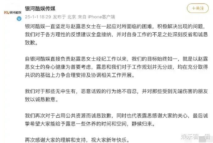 当晚,在赵露思发文回应后,其经纪公司银河酷娱传媒也紧急发文道歉:“银河酷娱一直坚定与赵露思女士在一起应对所面临的困难,积极解决出现的问题,我们对于各方理性的反馈建议全盘接纳,并对自身工作的不足之处深刻反省和诚恳致歉。”
