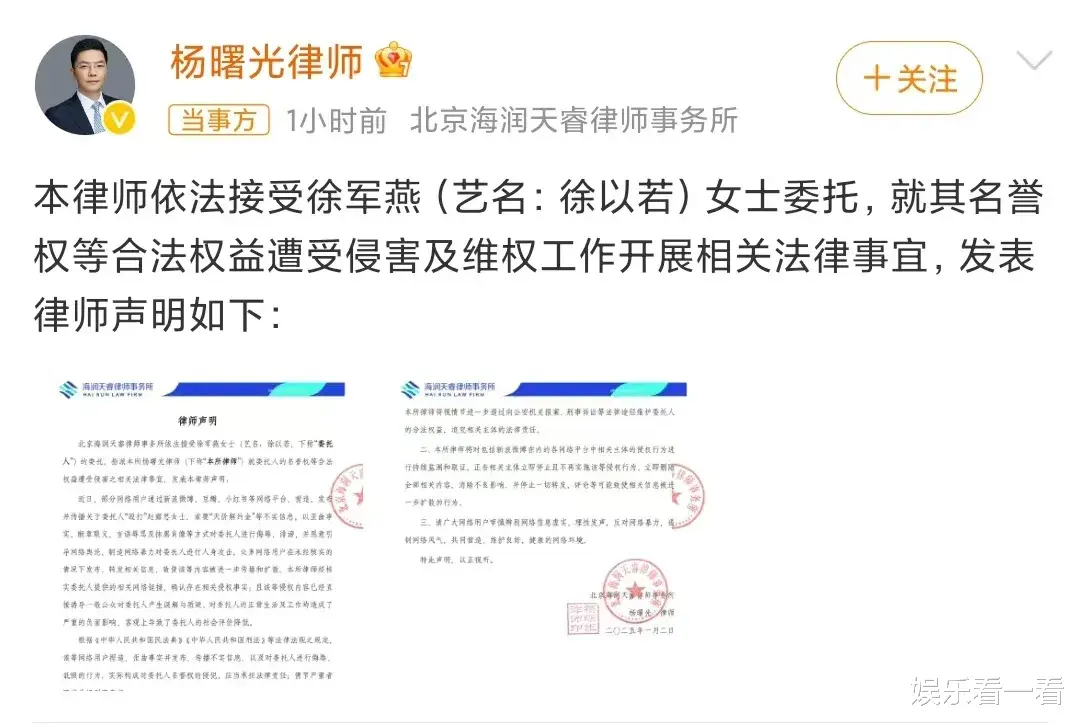1月2日,徐以若方紧急辟谣,其律师杨曙光发布律师声明称:“本律师依法接受徐军燕(艺名:徐以若)女士委托,就其名誉权等合法权益遭受侵害及维权工作开展相关法律事宜。”