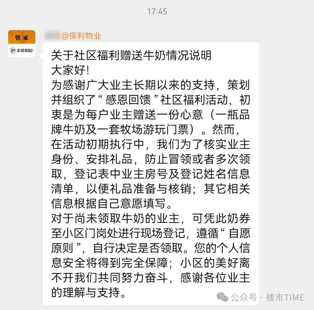 保利观堂物业,近日搞了个“暖冬福利”活动,说是感谢业主支持,每户送一盒牛奶和一套牧场门票。听着挺好对吧?但这世上哪有免费的午餐,免费的往往更贵。