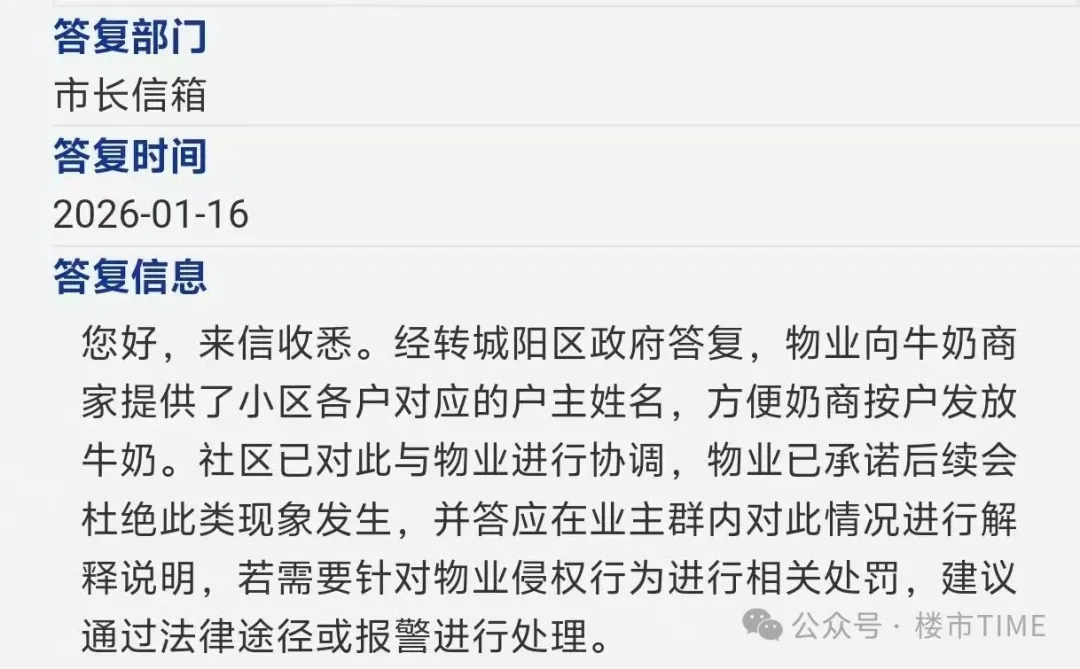 城阳区政府答复说:社区已经协调了,物业承诺杜绝此类现象,并答应在群里解释。重点来了——“若需要针对物业侵权行为进行相关处罚,建议通过法律途径或报警进行处理。”