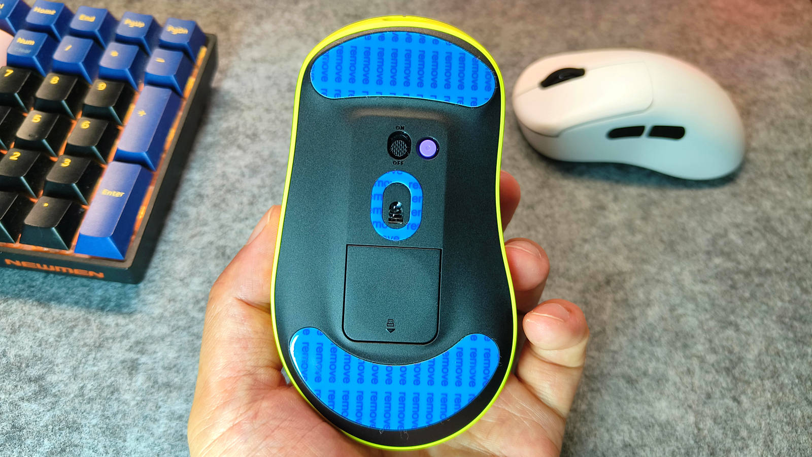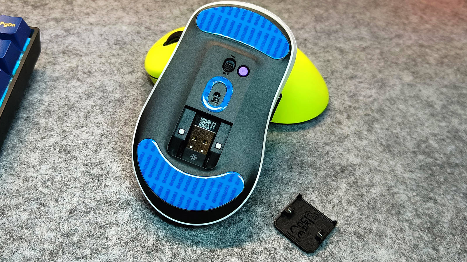 鼠标底部配备电源开关及一个防误触DIY独立按键。该按键默认用于循环切换回报率,用户还可通过雷柏驱动软件对其功能进行自定义或设定特定参数。鼠标共支持8个可编程按键,并同时兼容Windows与macOS系统,实现跨平台无缝使用。底部的磁吸盖板下隐藏有4K接收器专用收纳仓,便于日常存放接收器,有效防止丢失。
